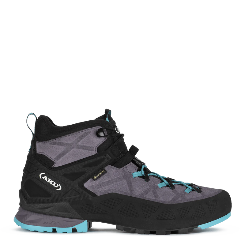 The Women's Rock DFS Mid uses AKU's exclusive Dual Fit System (“DFS”) to give you both maximum comfort during your approach and a high performance fit while climbing and scrambling. The Rock DFS Mid has two separate lace zones that utilize lightweight webbing that wraps around and under your foot which enables you to customize your fit. The Rock DFS midsole incorporates a lightweight EVA foam for cushioning and a polyurethane heel for durability and support. Together with a GORE-TEX breathable upper lining and a Vibram Approach sole with Megagrip, the resulting Rock DFS Mid GTX offers a high-performance approach shoe for all day comfort.